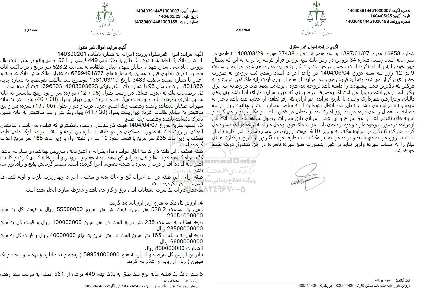 مزایده فروش ششدانگ یک قطعه خانه نوع ملک طلق به پلاک ثبتی 449 فرعی از 561 اصلی واقع در حوزه ثبت ملک بروجن، به مساحت 528.2 متر مربع