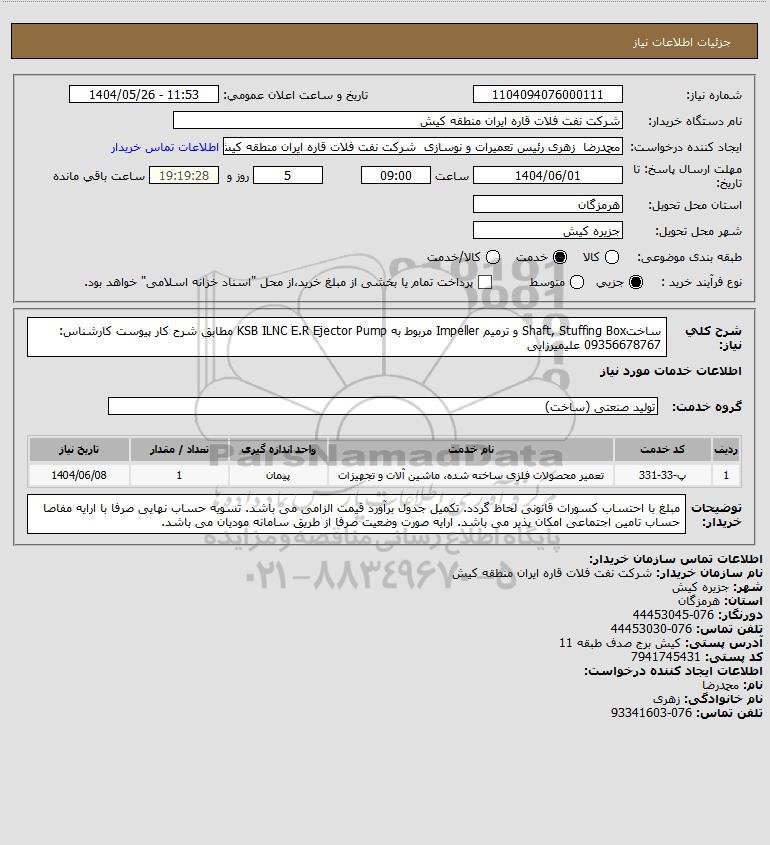 شرح کلی نیاز: ساختShaft, Stuffing Box و ترمیم Impeller مربوط به KSB ILNC E.R Ejector Pump مطابق شرح کار پیوست