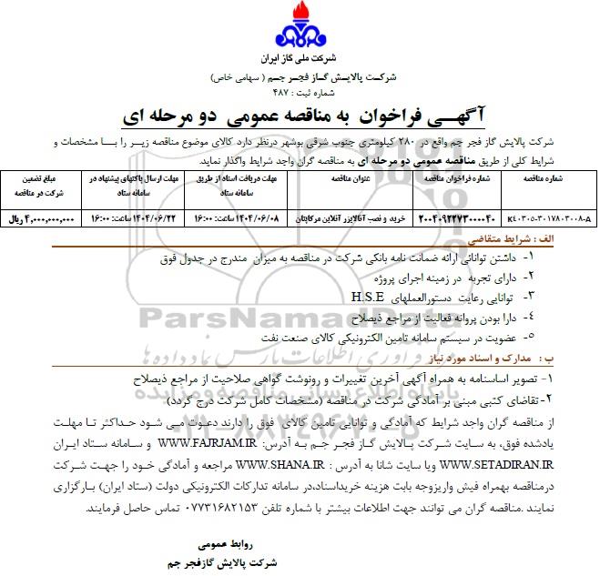شرکت پالایش گاز فجر جم واقع در 280 کیلومتری جنوب شرقی بوشهر در نظر دارد کالای موضوع مناقصه زیر را با مشخصات و شرایط کلی از طریق مناقصه عمومی دو مرحله ای به مناقصه گران واجد شرایط واگذار نماید.