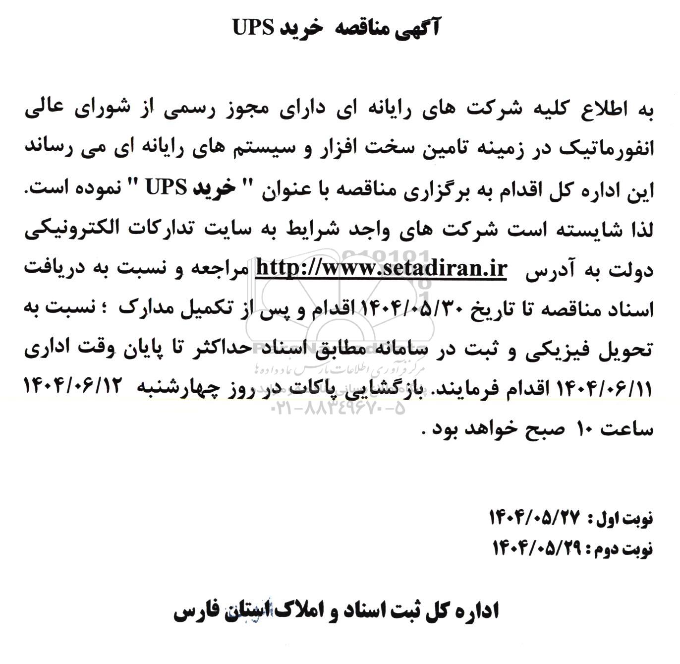 مناقصه خرید UPS از کلیه افراد متخصص و شرکتها واجد شرایط دعوت به عمل میآید در مناقصه با کد خبرگزاری پارس نماد: 9419180 شرکت نمایند.