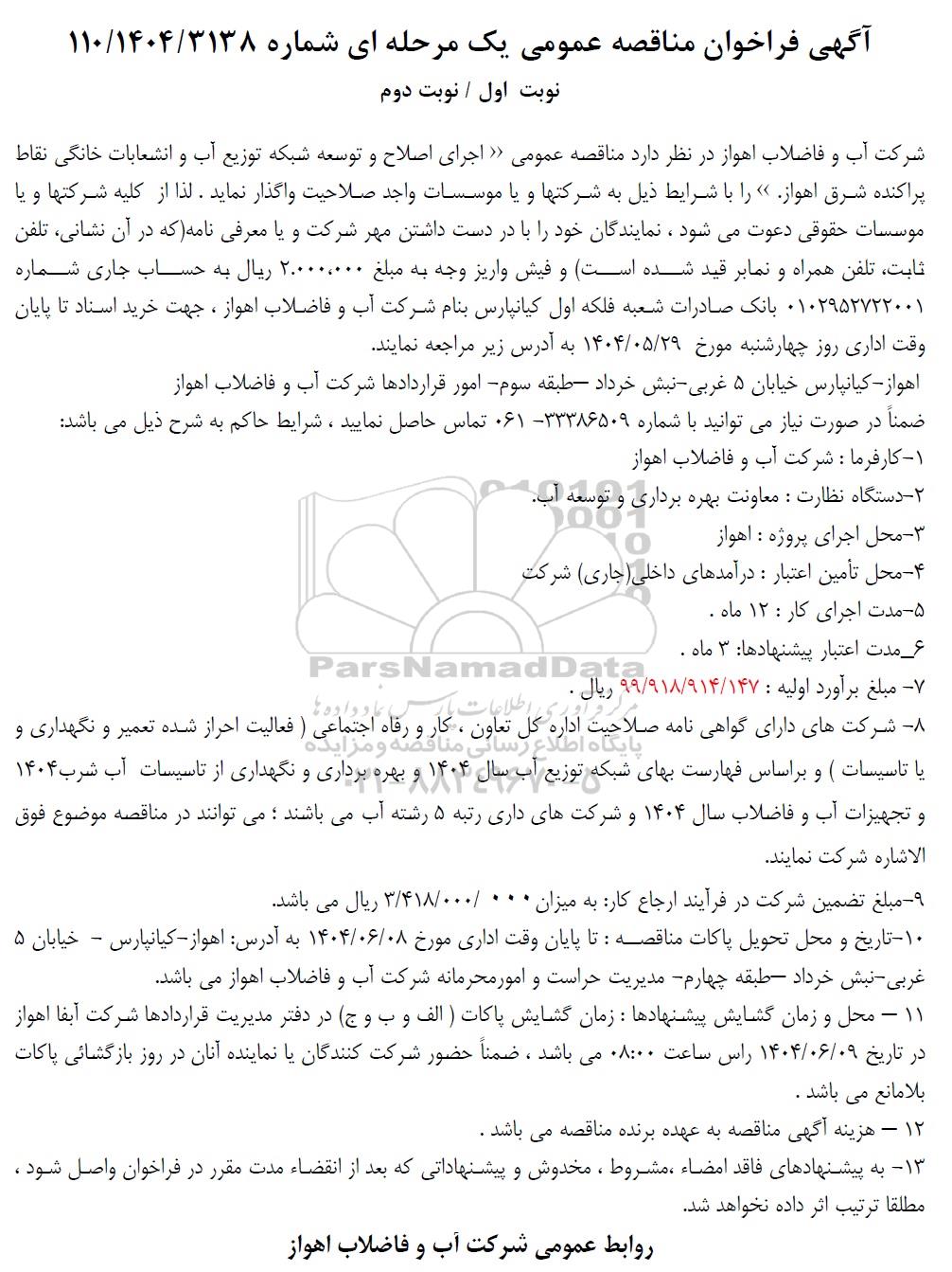 شرکت آب و فاضلاب اهواز در نظر دارد مناقصه عمومی اجرای اصلاح و توسعه شبکه توزیع آب و انشعابات خانگی نقاط پراکنده شرق اهواز را با شرایط ذیل به شرکتها و یا موسسات واجد صلاحیت واگذار نماید. لذا از کلیه شرکتها و یا موسسات حقوقی دعوت میشود نمایندگان خود را با در دست داشتن مهر شرکت و یا معرفی نامه که در آن نشانی تلفن ثابت تلفن همراه و نمایر قید شده است و فیش واریز وجه به مبلغ 2.000.000 ریال به حساب جاری شماره 0102952722001 بانک صادرات شعبه فلکه اول کیانپارس بنام شرکت آب و فاضلاب اهواز، جهت خرید اسناد تا پایان وقت اداری روز چهارشنبه مورخ 1404.5.29 به آدرس زیر مراجعه نمایند.