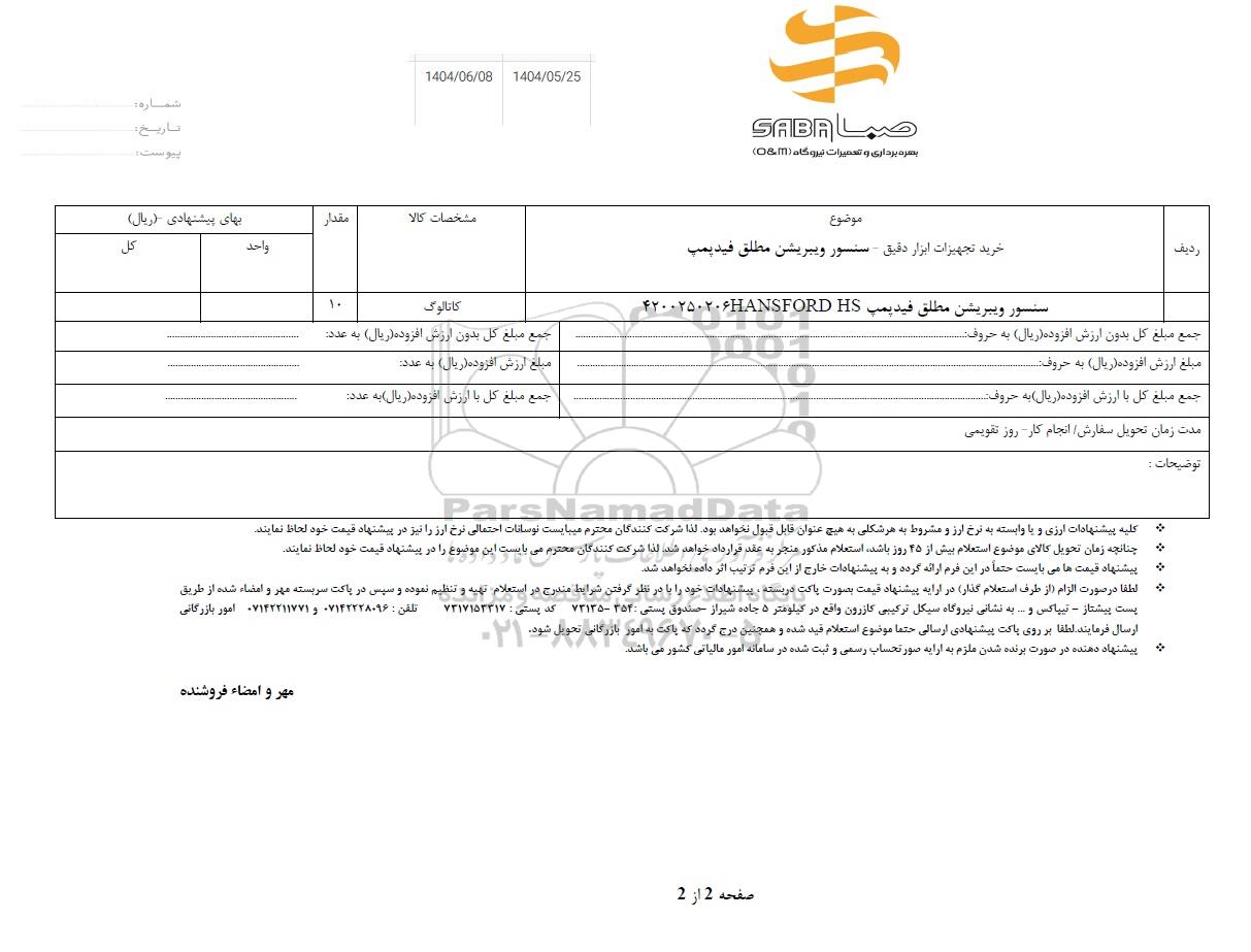 استعلام بها و موضوع استعلام استعلام سنسور ویبریشن مطلق فید پمپ HANSFORD HS 4200250206 به اطلاع کلیه شرکتها و افراد متخصص واجد شرایط میرساند، آگهی گذار در نظر دارد از طریق استعلام بها، نسبت به انتخاب و دریافت پیشنهادات اقدام نماید. این استعلام با کد آگهی ثبت شده در سامانه خبرگزاری پارس نماد : 9419280 منتشر شده است. مشخصات استعلام : تاریخ شروع استعلام: 1404/05/26 آخرین مهلت ارسال پیشنهاد قیمت : 1404/06/08 و محل اجرای پروژه : استان فارس میباشد. استعلام قیمت مورد درخواست : استعلام سنسور ویبریشن مطلق فید پمپ HANSFORD HS 4200250206 با دستهبندیهای تخصصی و گروه های مرتبط : ابزار دقیق, الکتروموتور و پمپ های شناور, نیروگاه, تجهیزات برق و الکترونیک, استعلام اطلاع رسانی میگردد. شرایط شرکت در استعلام آنلاین : ابتدا ثبت نام در سامانه استعلام پارس نماد و تکمیل مدارک موردنیاز و بارگذاری در سامانه رعایت تمامی ضوابط و الزامات مندرج در اسناد استعلام است.