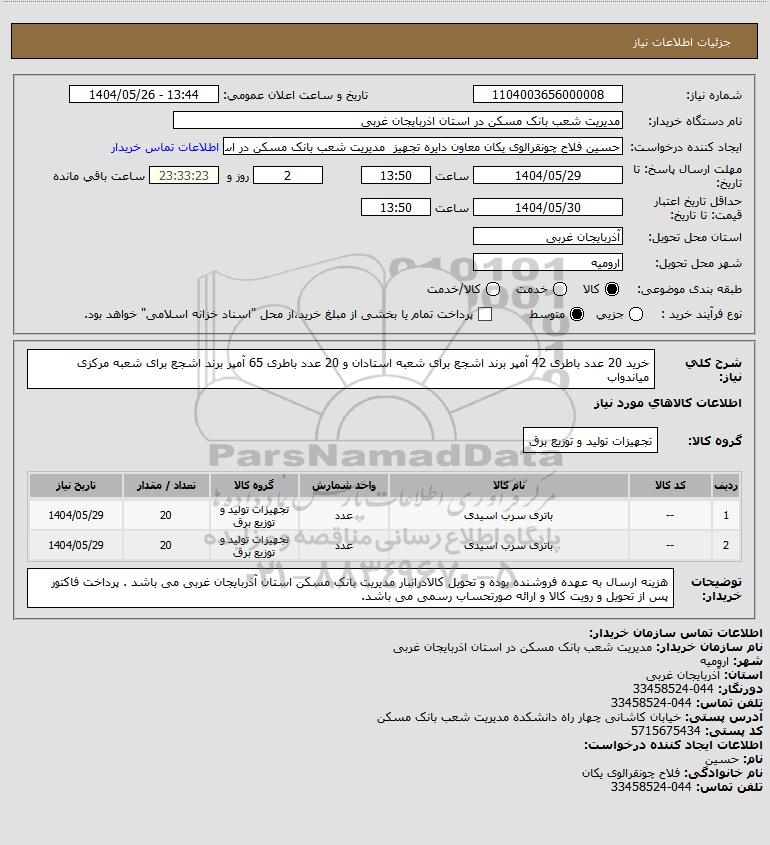 شرح کلی نیاز: خرید 20 عدد باطری 42 آمپر برند اشجع برای شعبه استادان و 20 عدد باطری 65 آمپر برند اشجع برای شعبه مرکزی میاندواب