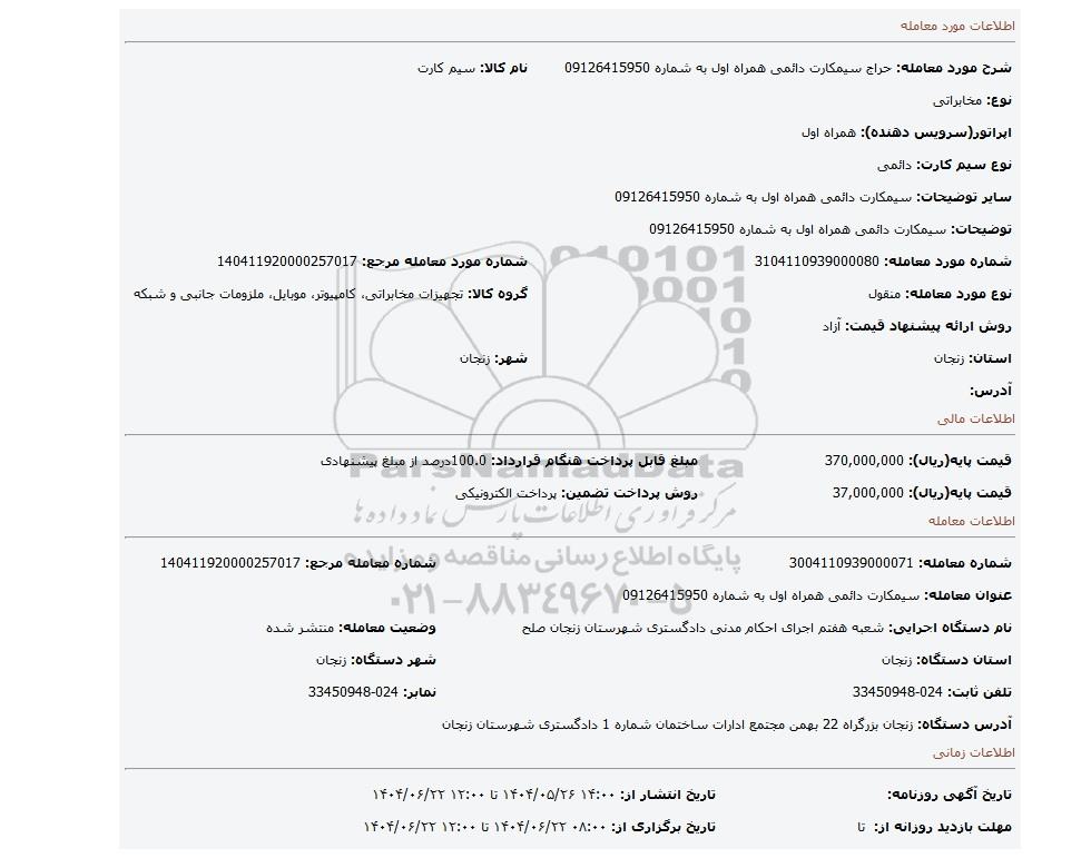 عنوان معامله: سیمکارت دائمی همراه اول به شماره 09126415950