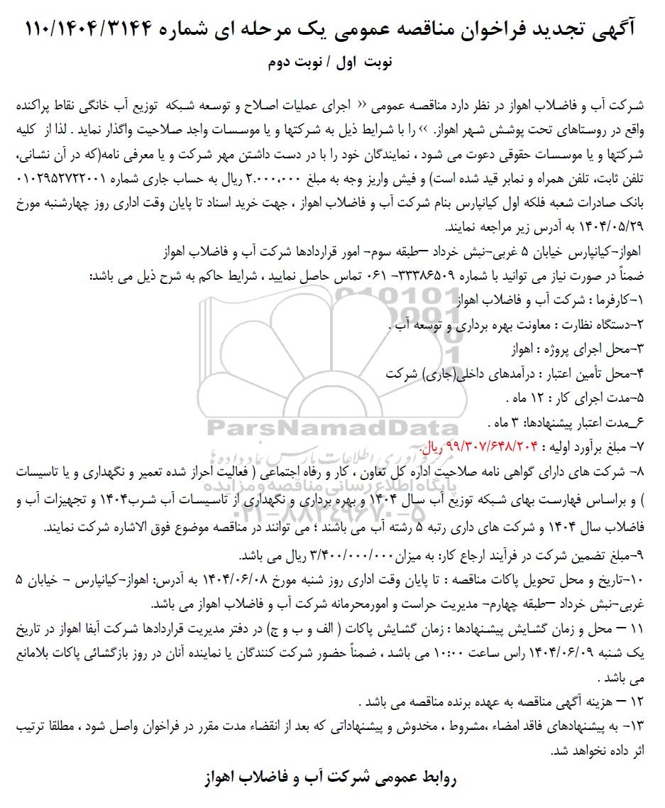 شرکت آب و فاضلاب اهواز در نظر دارد مناقصه عمومی « اجرای عملیات اصلاح و توسعه شبکه توزیع آب خانگی نقاط پراکنده واقع در روستاهای تحت پوشش شهر اهواز » را با شرایط ذیل به شرکتها و یا موسسات واجد صلاحیت واگذار نماید. لذا از کلیه شرکتها و یا موسسات حقوقی دعوت می شود، نمایندگان خود را با در دست داشتن مهر شرکت و یا معرفی نامه (که در آن نشانی، تلفن ثابت، تلفن همراه و نمابر قید شده است) و فیش واریز وجه به مبلغ 2.000.000 ریال به حساب جاری شماره 0102952722001 بانک صادرات شعبه فلکه اول کیانپارس بنام شرکت آب و فاضلاب اهواز ، جهت خرید اسناد تا پایان وقت اداری روز 4شنبه مورخ 1404.05.29 به آدرس زیر مراجعه نمایند.