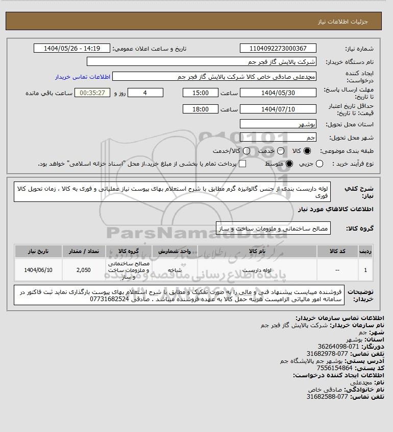 شرح کلی نیاز: لوله داربست بندی از جنس گالوانیزه گرم مطابق با شرح استعلام بهای پیوست نیاز عملیاتی و فوری به کالا ، زمان تحویل کالا فوری