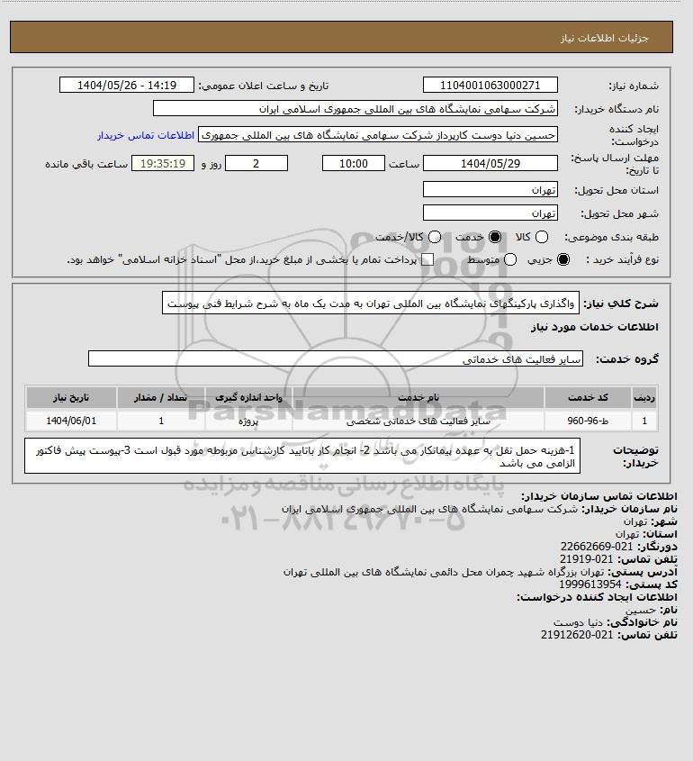 شرح کلی نیاز: واگذاری پارکینگهای نمایشگاه بین المللی تهران به مدت یک ماه به شرح شرایط فنی پیوست