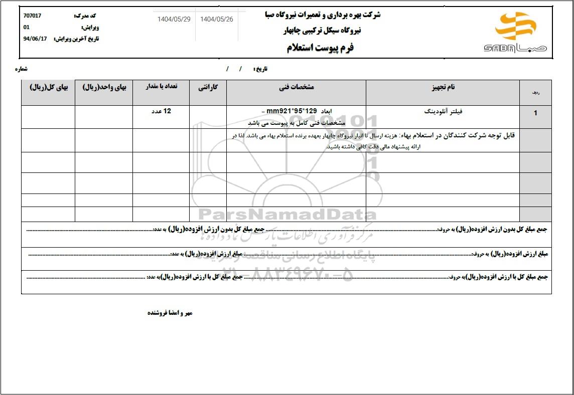 استعلام بها و موضوع استعلام استعلام فیلتر آنلودینگ به اطلاع کلیه شرکتها و افراد متخصص واجد شرایط میرساند، آگهی گذار در نظر دارد از طریق استعلام بها، نسبت به انتخاب و دریافت پیشنهادات اقدام نماید. این استعلام با کد آگهی ثبت شده در سامانه خبرگزاری پارس نماد : 9419555 منتشر شده است. مشخصات استعلام : تاریخ شروع استعلام: 1404/05/26 آخرین مهلت ارسال پیشنهاد قیمت : 1404/05/29 و محل اجرای پروژه : استان سیستان و بلوچستان میباشد. استعلام قیمت مورد درخواست : استعلام فیلتر آنلودینگ با دستهبندیهای تخصصی و گروه های مرتبط : انواع فیلتر های تصفیه, نیروگاه, تجهیزات برق و الکترونیک, استعلام اطلاع رسانی میگردد. شرایط شرکت در استعلام آنلاین : ابتدا ثبت نام در سامانه استعلام پارس نماد و تکمیل مدارک موردنیاز و بارگذاری در سامانه رعایت تمامی ضوابط و الزامات مندرج در اسناد استعلام است.