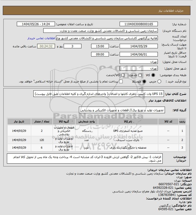| 3 | -- | محفظه یا جایگاه نگهدارنده باتری | عدد | تجهیزات تولید و توزیع برق | 6 | 1404/05/29 |