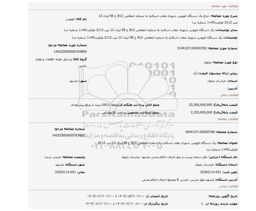 1 مزایده یک دستگاه اتوبوس شهری اسکانیا تیپ 3112 با شماره انتظامی 644 ع 95 ایران 12 -شماره موتور 6667171-شم 9653602 1404/07/14 new not special not payed خراسان رضوی