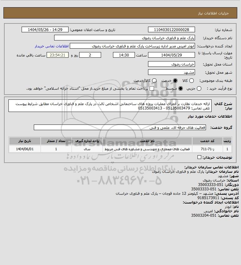 شرح کلی نیاز: ارائه خدمات نظارت بر اجرای عملیات پروژه های ساختمانی اشخاص ثالث در پارک علم و فناوری خراسان مطابق شرایط پیوست تلفن تماس: 05135003479 - 05135003413