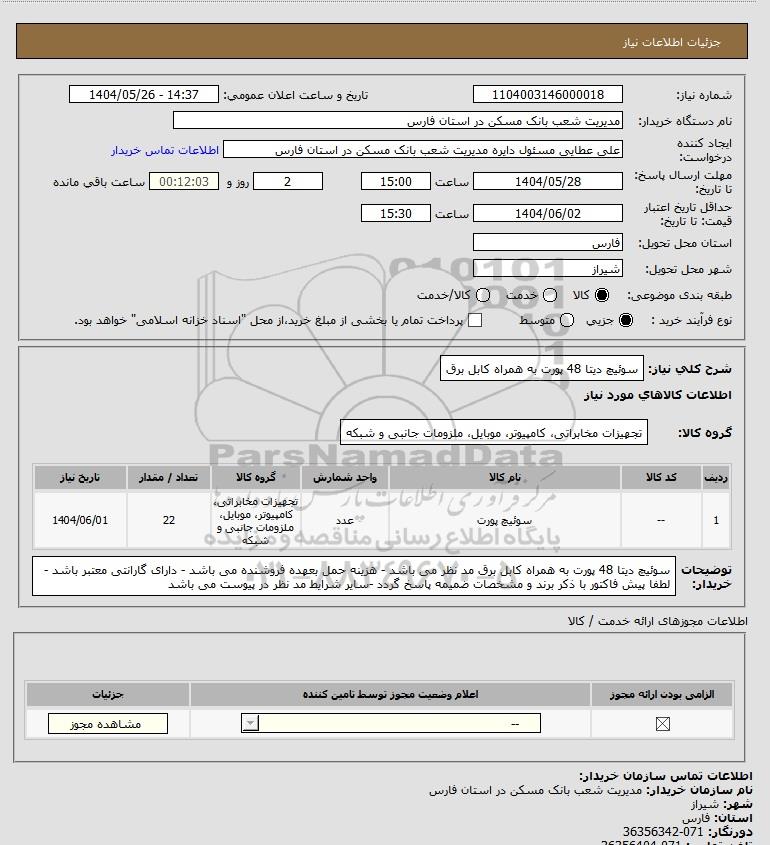 شرح کلی نیاز: سوئیچ دیتا 48 پورت به همراه کابل برق