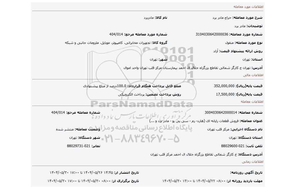 نام دستگاه اجرایی: مرکز قلب تهرانوضعیت معامله: منتشر شده