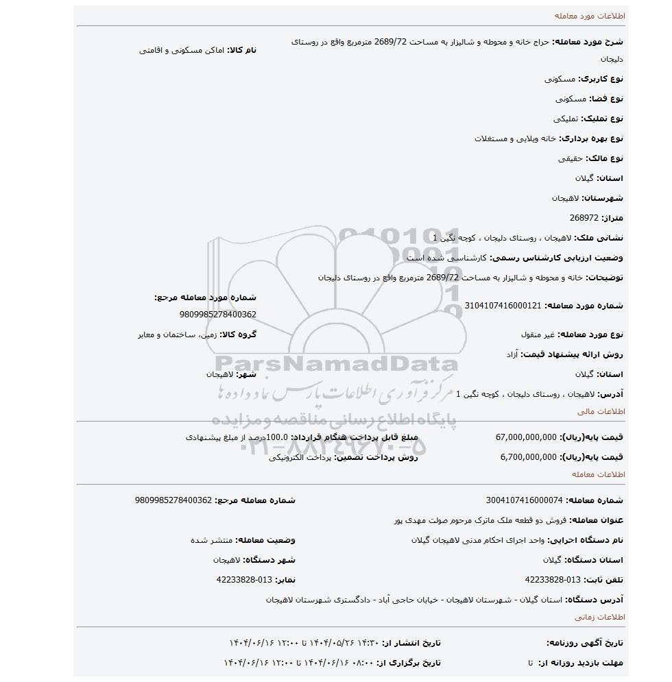 شرح مورد معامله: حراج خانه و محوطه و شالیزار به مساحت 2689/72 مترمربع واقع در روستای دلیجان | نام کالا: اماکن مسکونی و اقامتی | |