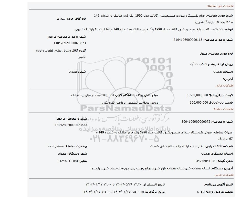 عنوان معامله: فروش یکدستگاه سواری میتسوبیشی گالانت مدل 1990 رنگ قرمز متالیک به شماره 149 م 67 ایران 18 | ||