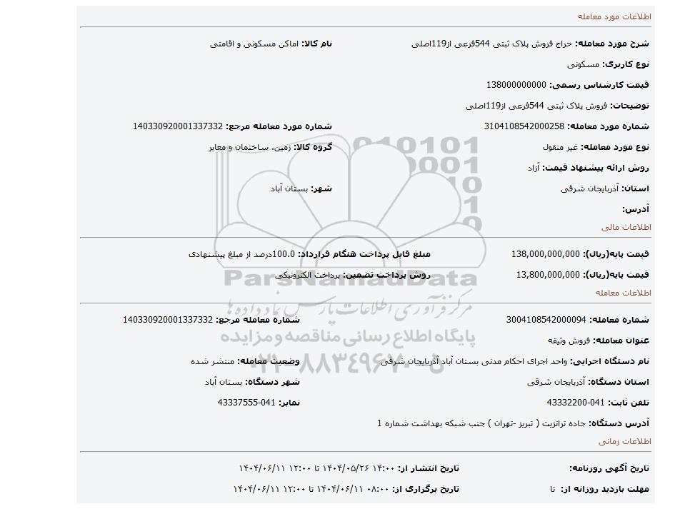 مزایده فروش پلاک ثبتی 544فرعی از119اصلی, مزایده، فروش پلاک ثبتی 544فرعی از119اصلی