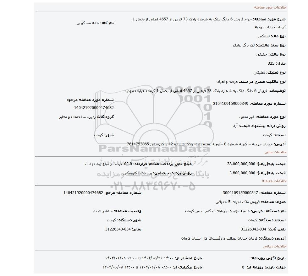 نام دستگاه اجرایی: شعبه مزایده اجراهای احکام مدنی کرمان | وضعیت معامله: منتشر شده | |