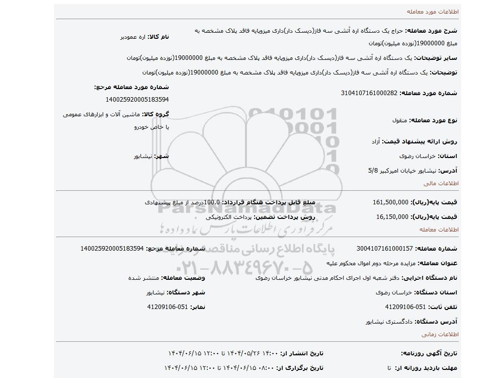شماره مورد معامله: 3104107161000282 | شماره مورد معامله مرجع: 140025920005183594 | |