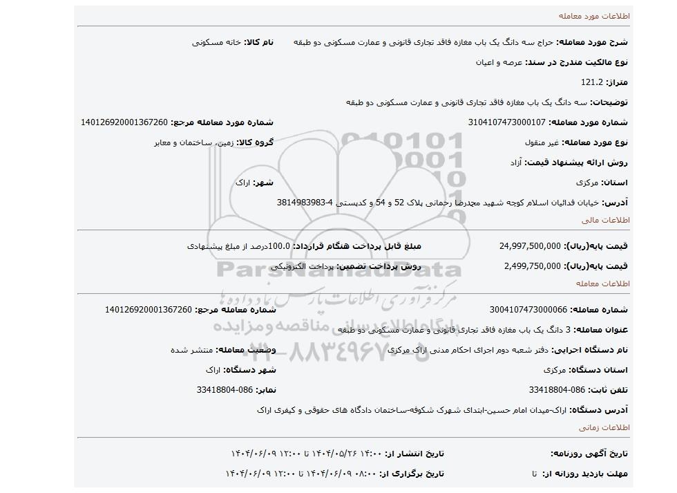 شرح مورد معامله: حراج سه دانگ یک باب مغازه فاقد تجاری قانونی و عمارت مسکونی دو طبقه | نام کالا: خانه مسکونی | |