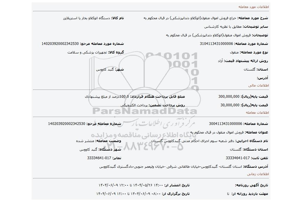مزایده عمومی مزایده فروش اموال منقول(اتوکلاو دندانپزشکی) در قبال محکوم به برگزار میگردد. از کلیه افراد متخصص و شرکت‌های واجد شرایط دعوت به عمل می‌آید تا در این مزایده با کد خبرگزاری پارس نماد : 9419742 شرکت نمایند تاریخ شروع مزایده : 1404/05/26 مهلت شرکت در مزایده: تا پایان روز 1404/06/09 مکان برگزاری اموال واگذاری استان‌های گلستان و دسته‌بندی‌های مربوط به این حراجی متفرقه میباشد. اطلاعات دقیق‌تر درباره شرایط شرکت در مزایده آنلاین و نحوه ارسال مدارک، الزامات پروژه و دریافت اسناد مزایده و تاریخ بازگشایی پاکت‌ها، در بخش اطلاعات تکمیلی این آگهی درج شده است.