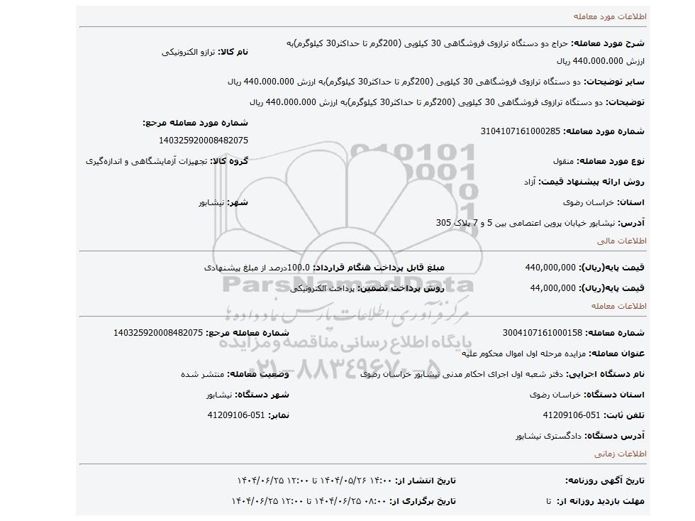 شرح مورد معامله: حراج دو دستگاه ترازوی فروشگاهی 30 کیلویی (200گرم تا حداکثر30 کیلوگرم)به ارزش 440.000.000 ریال | نام کالا: ترازو الکترونیکی | |