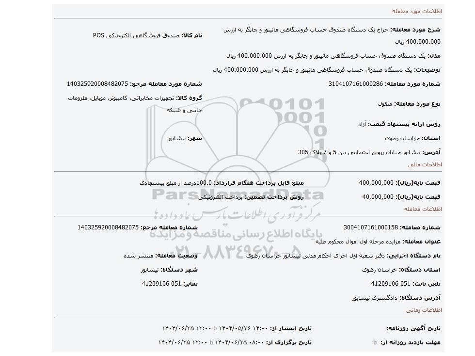 شرح مورد معامله: حراج یک دستگاه صندوق حساب فروشگاهی مانیتور و چاپگر به ارزش 400.000.000 ریال | نام کالا: صندوق فروشگاهی الکترونیکی POS | |