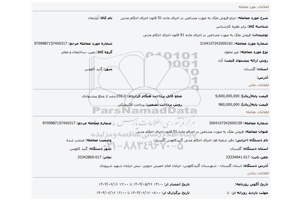 شرح مورد معامله: حراج فروش ملک به صورت مشاعی در اجرای ماده 51 قانون اجرای احکام مدنی | نام کالا: آپارتمان | |