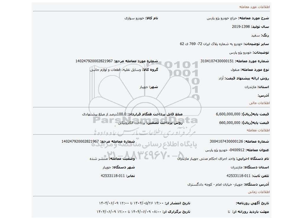 شرح مورد معامله: حراج خودرو پژو پارس | نام کالا: خودرو سواری | |