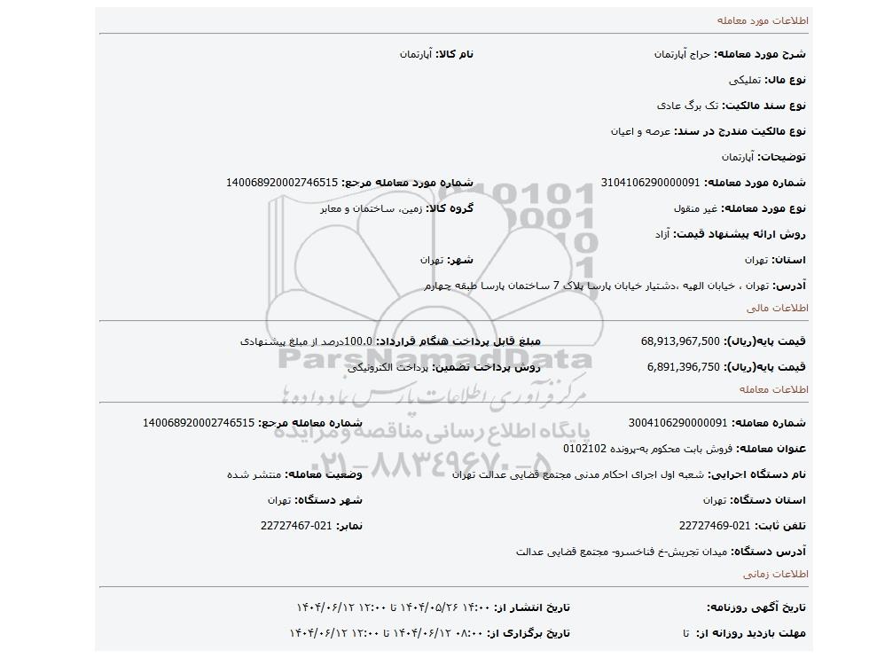 شرح مورد معامله: حراج آپارتماننام کالا: آپارتمان