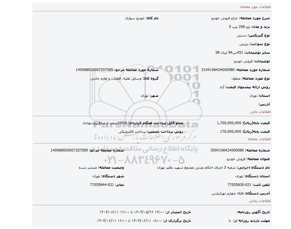 3 مزایده پژو 405 شماره انتظامی 45-277ب69 9654033 1404/07/14 new not special not payed تهران