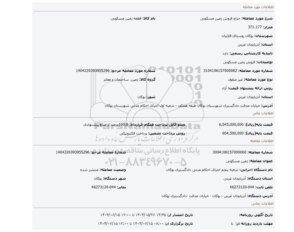 شرح مورد معامله: حراج فروش زمین مسکونی | نام کالا: قطعه زمین مسکونی | |