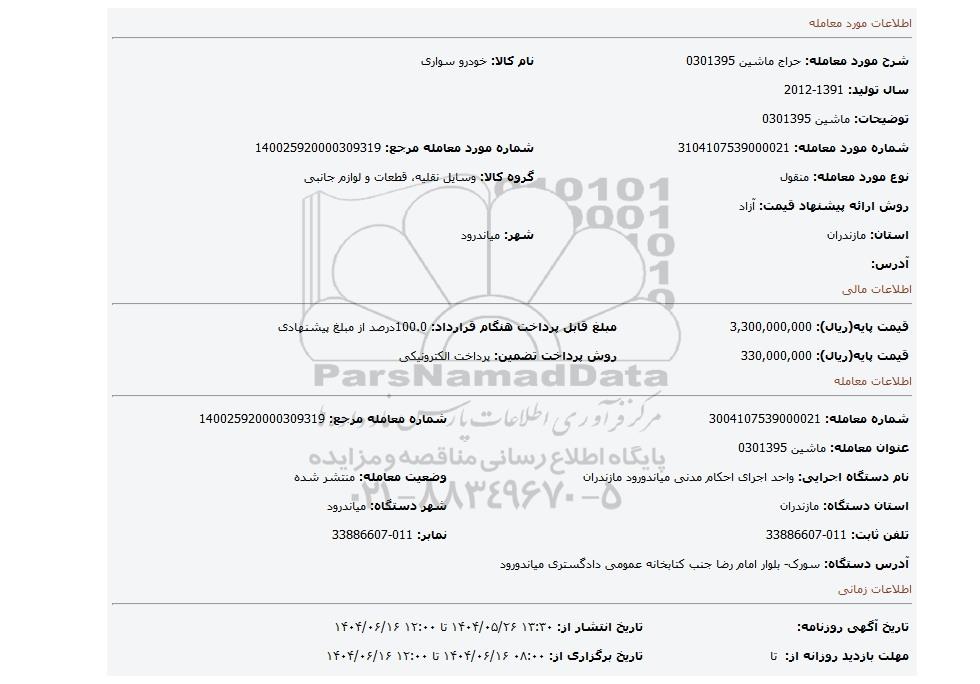 شرح مورد معامله: حراج ماشین 0301395 | نام کالا: خودرو سواری | |