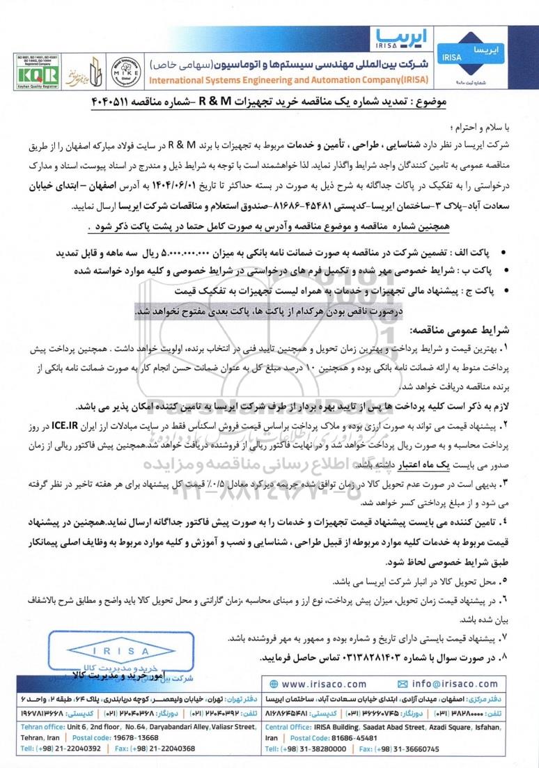 شرکت ایریسا در نظر دارد شناسایی، طراحی، تأمین و خدمات مربوط به تجهیزات با برند R & M در سایت فولاد مبارکه اصفهان را از طریق مناقصه عمومی به تامین کنندگان واجد شرایط واگذار نماید. لذا خواهشمند است با توجه به شرایط ذیل و مندرج در اسناد پیوست، اسناد و مدارک درخواستی را به تفکیک در پاکات جداگانه به شرح ذیل به صورت در بسته حداکثر تا تاریخ 1404.06.01 به آدرس اصفهان - ابتدای خیابان سعادت آباد - پلاک 3 - ساختمان ایریسا کدپستی 45481 - 81686 - صندوق استعلام و مناقصات شرکت ایریسا ارسال نمایید.
