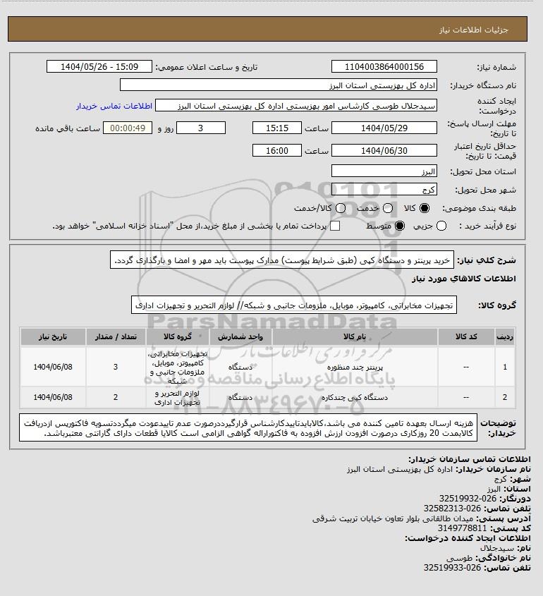 شرح کلی نیاز: خرید پرینتر و دستگاه کپی (طبق شرایط پیوست) مدارک پیوست باید مهر و امضا و بارگذاری گردد.