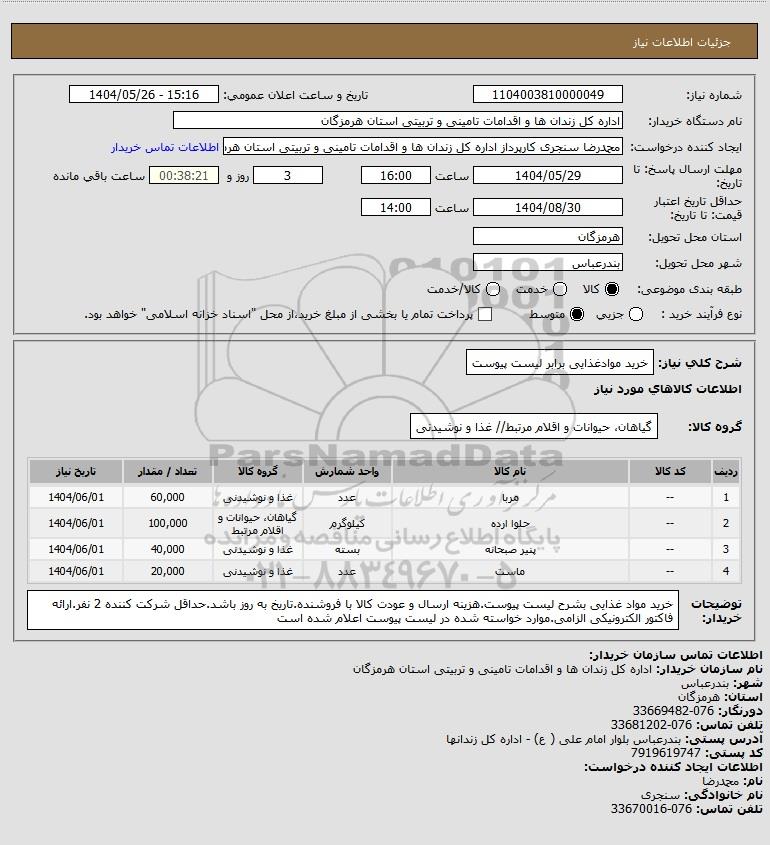 شرح کلی نیاز: خرید موادغذایی برابر لیست پیوست