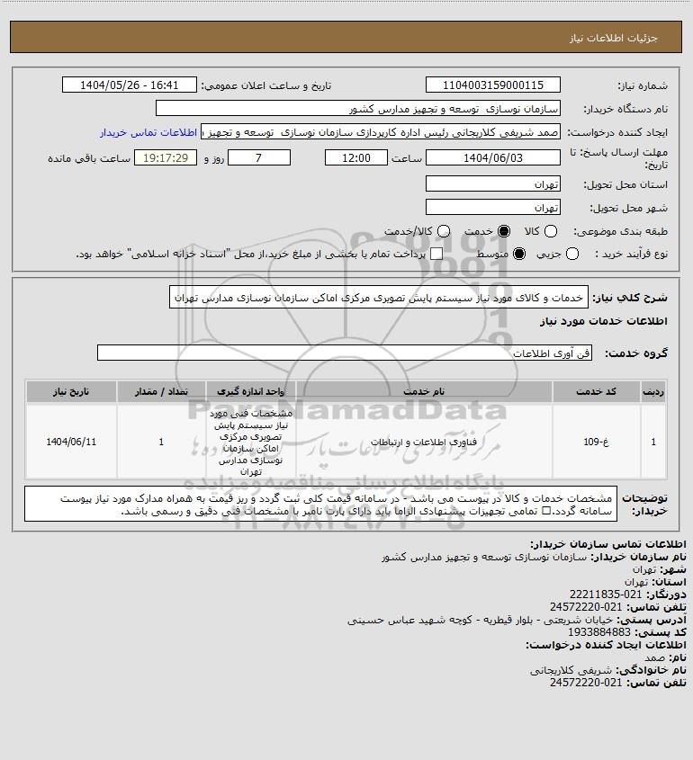 شرح کلی نیاز: خدمات و کالای مورد نیاز سیستم پایش تصویری مرکزی اماکن سازمان نوسازی مدارس تهران
