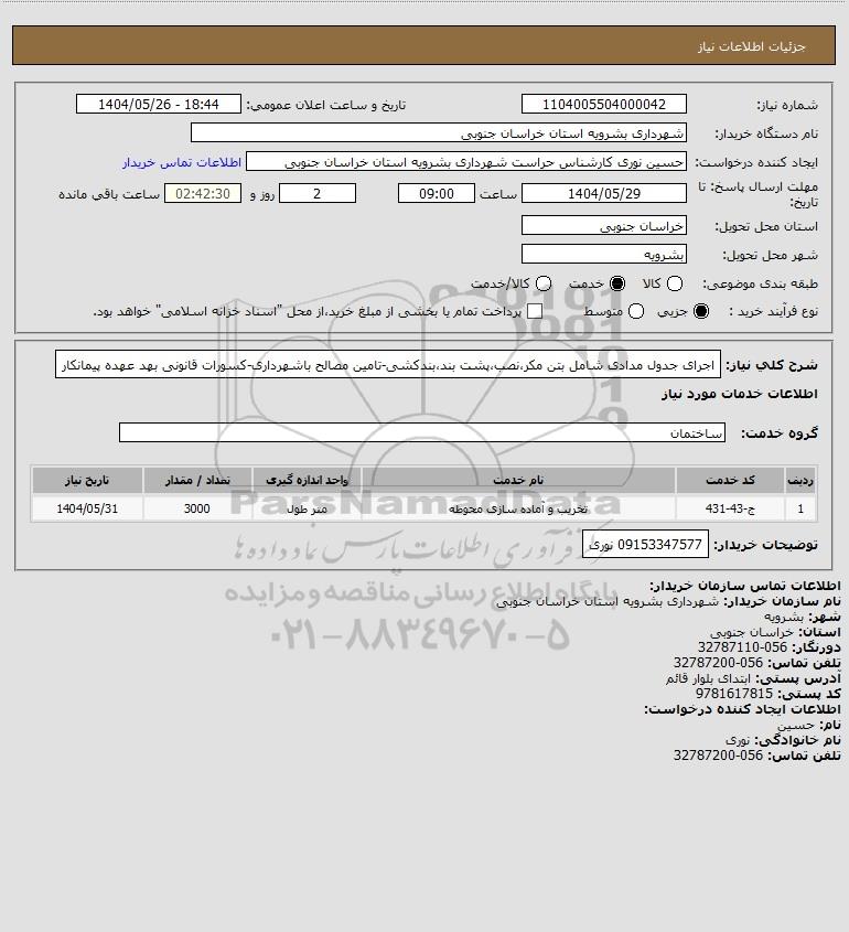شرح کلی نیاز: اجرای جدول مدادی شامل بتن مکر،نصب،پشت بند،بندکشی-تامین مصالح باشهرداری-کسورات قانونی بهد عهده پیمانکار