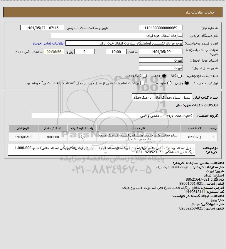 توضیحات خریدار:تبدیل اسناد ومدارک مالی به میکروفیلم یا ذخیره سازیاسناد (ایجاد سیستم آرشیوالکترونیکی اسناد مالی) حدود1.000.000 برگ