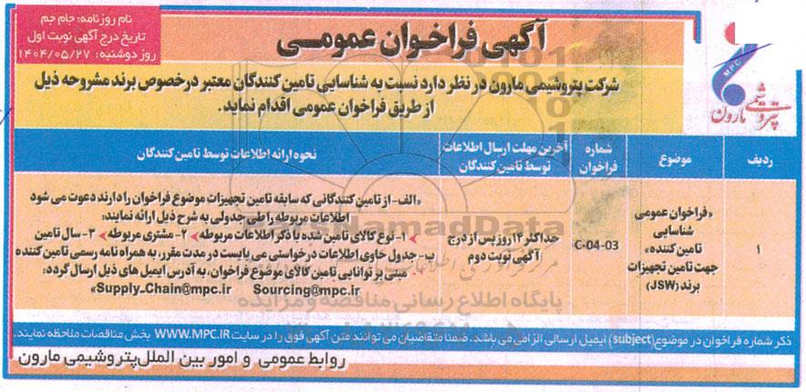 موضوع: فراخوان عمومی شناسایی تأمین کننده جهت تأمین تجهیزات برند (JSW)