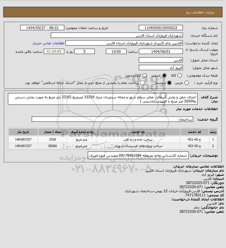 شرح کلی نیاز: اجرای حمل و پخش آسفالت معابر سطح شهر و محله سرمیدان متراژ 33330 مترمربع (3330 متر مربع به صورت پخش دستی و30000 متر مربع با فینیشر(ماشینی )