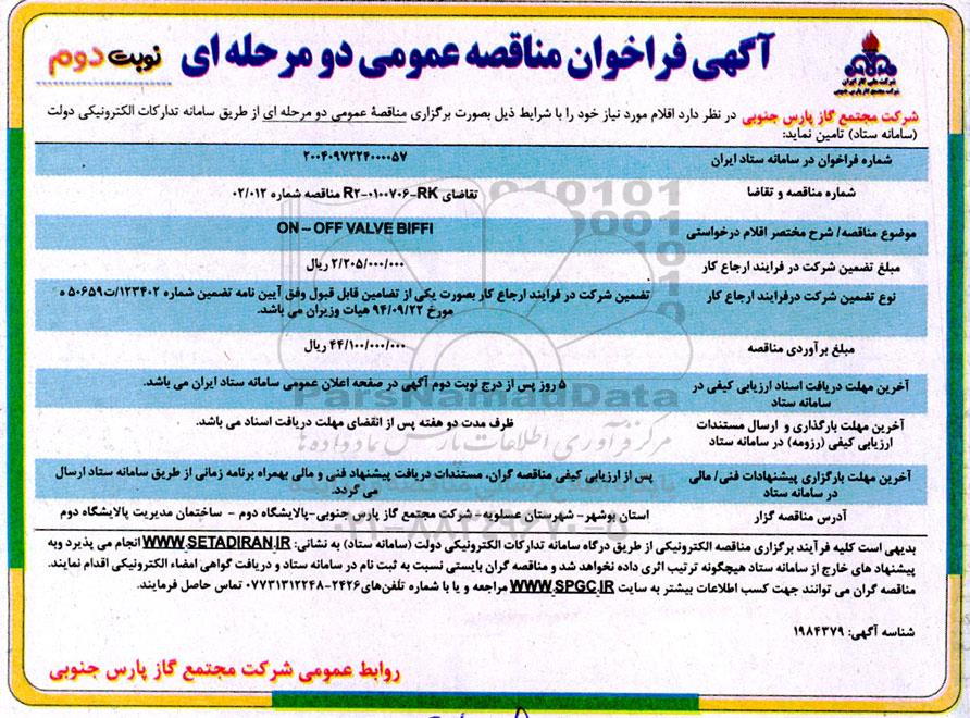 فراخوان مناقصه ON - OFF VALVE BIFFI - نوبت دوم از کلیه افراد متخصص و شرکتها واجد شرایط دعوت به عمل میآید در مناقصه با کد خبرگزاری پارس نماد: 9421162 شرکت نمایند.