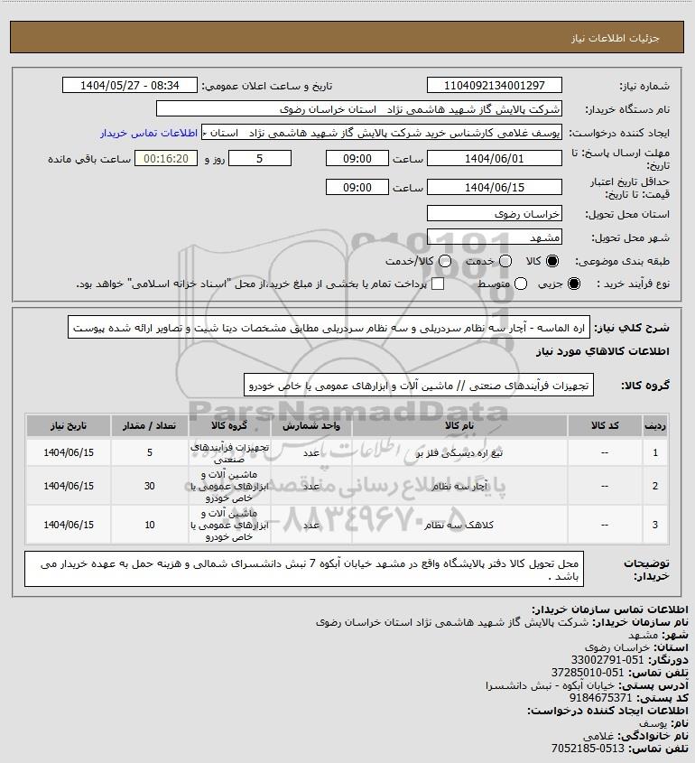 نام دستگاه خریدار:شرکت پالایش گاز شهید هاشمی نژاد استان خراسان رضوی