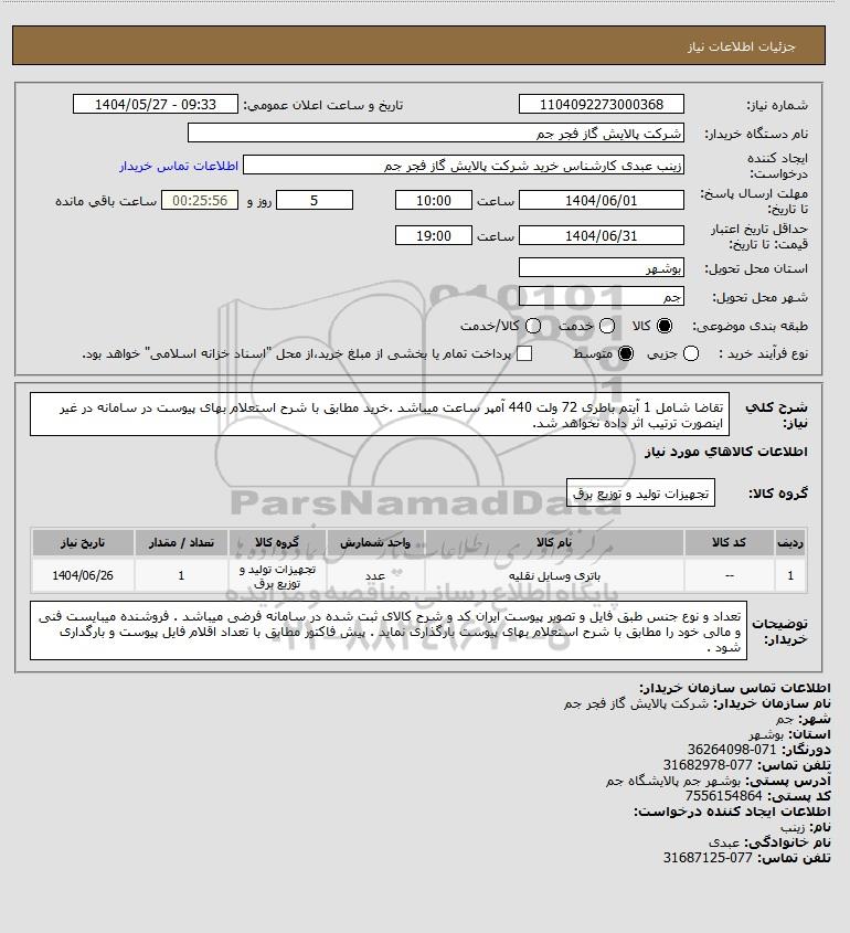 شرح کلی نیاز: تقاضا شامل 1 آیتم باطری 72 ولت 440 آمپر ساعت میباشد .خرید مطابق با شرح استعلام بهای پیوست در سامانه در غیر اینصورت ترتیب اثر داده نخواهد شد.
