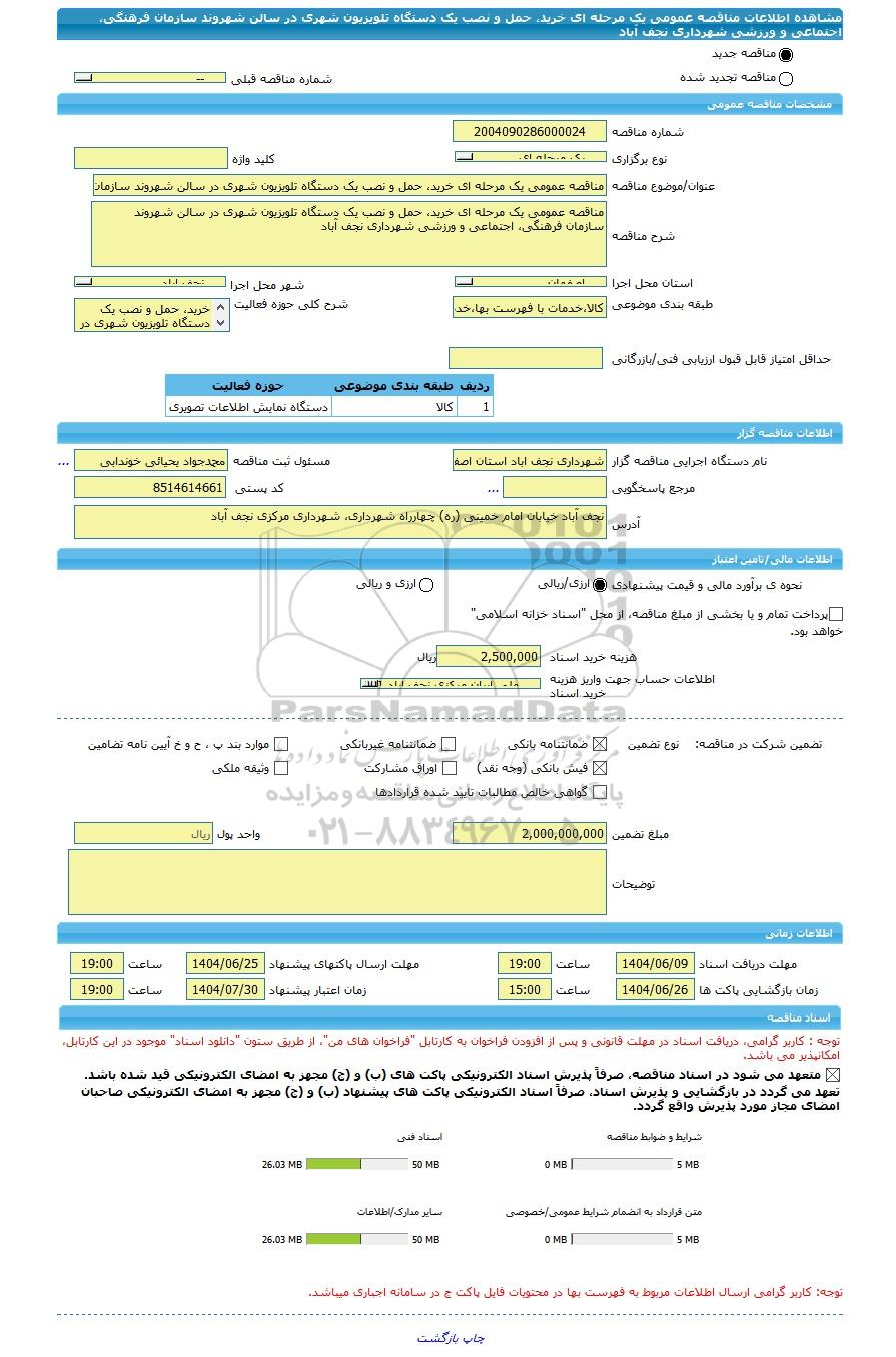 شرح مناقصهمناقصه عمومی یک مرحله ای خرید، حمل و نصب یک دستگاه تلویزیون شهری در سالن شهروند سازمان فرهنگی، اجتماعی و ورزشی شهرداری نجف آباد