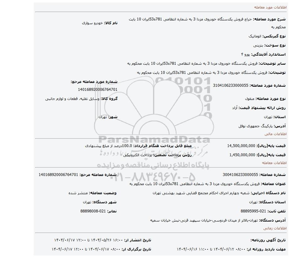 عنوان معامله: فروش یکدستگاه خودروی مزدا 3 به شماره انتظامی 781ه53ایران 10 بابت محکوم به