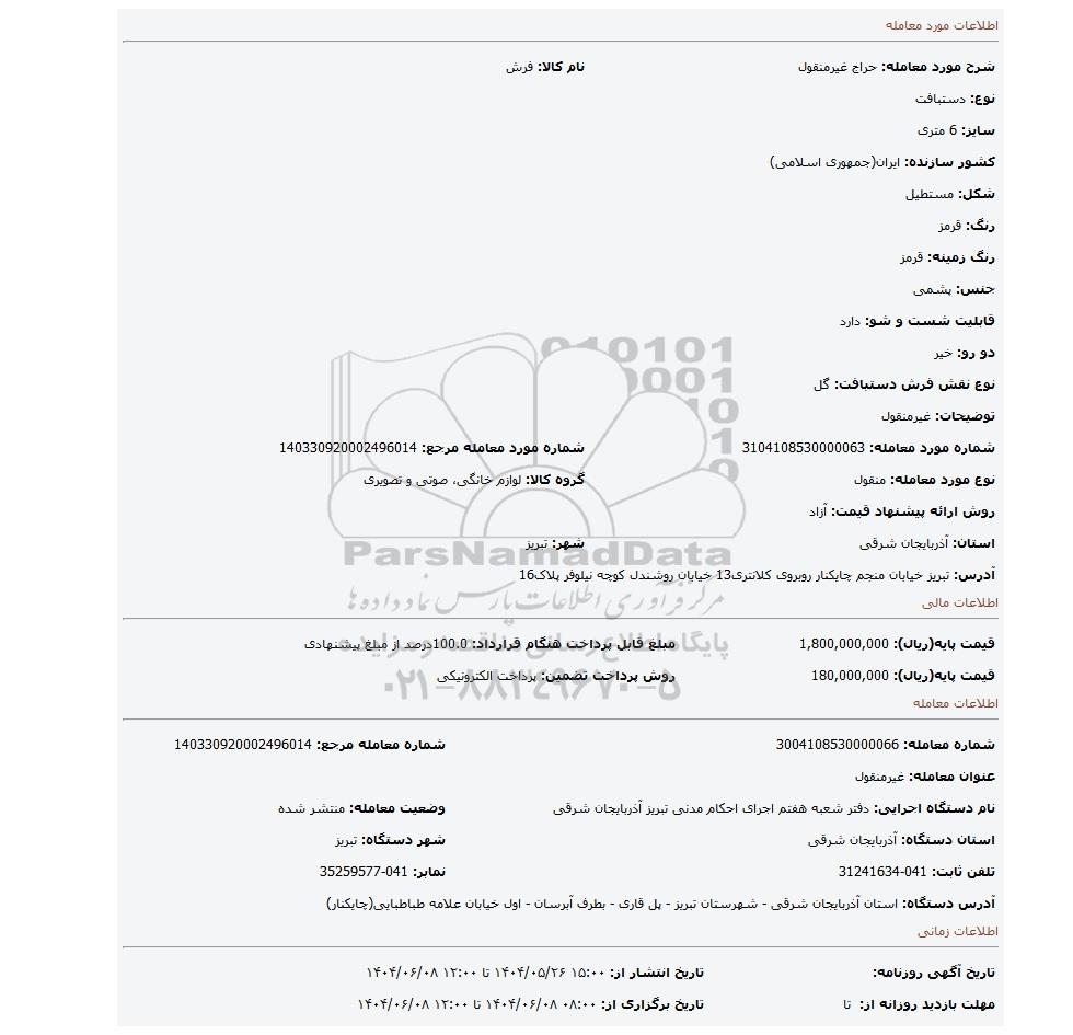 | شرح مورد معامله: حراج غیرمنقول | نام کالا: فرش | |