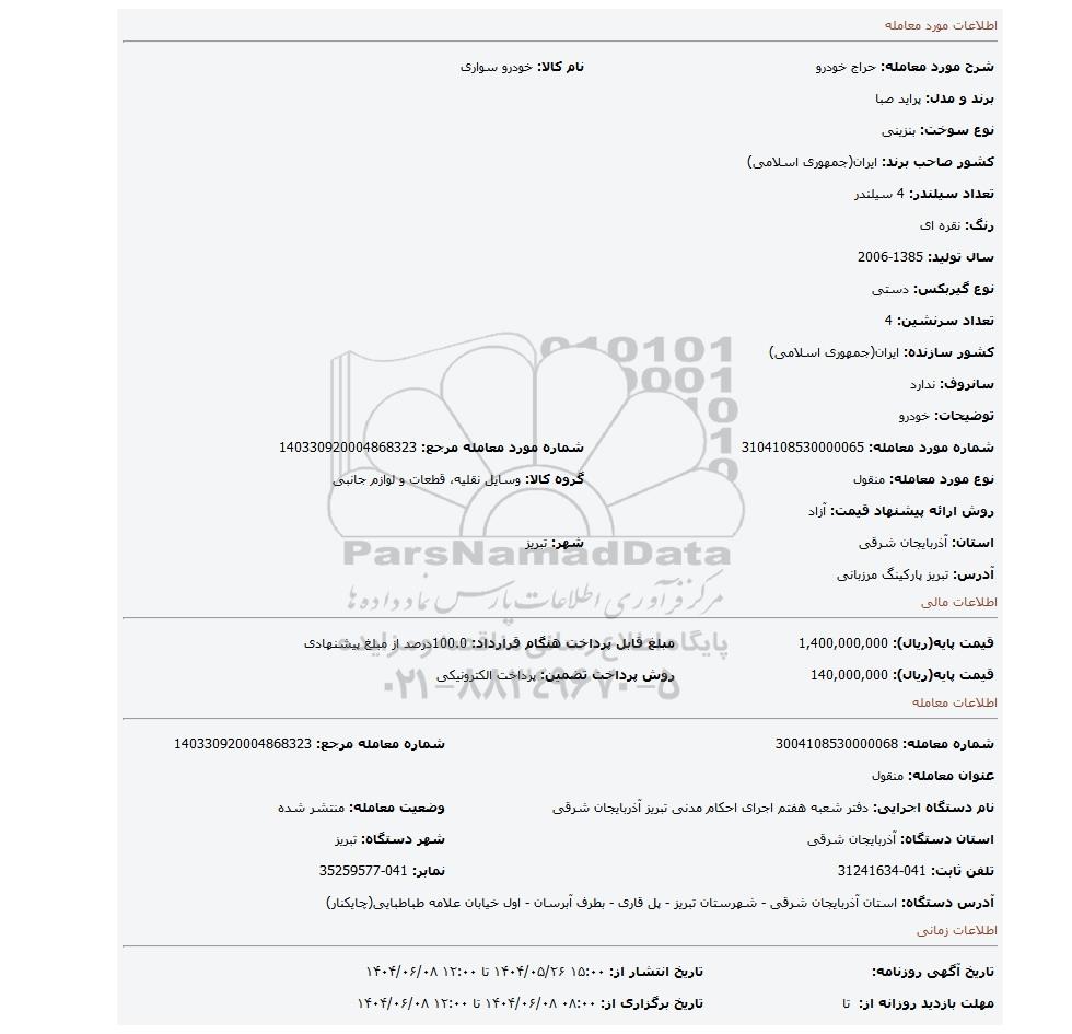 | شماره مورد معامله: 3104108530000065 | شماره مورد معامله مرجع: 140330920004868323 | |