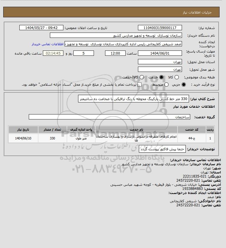 شرح کلی نیاز: 330 متر خط کشی پارکینگ محوطه با رنگ ترافیکی با ضخامت ده سانتیمتر