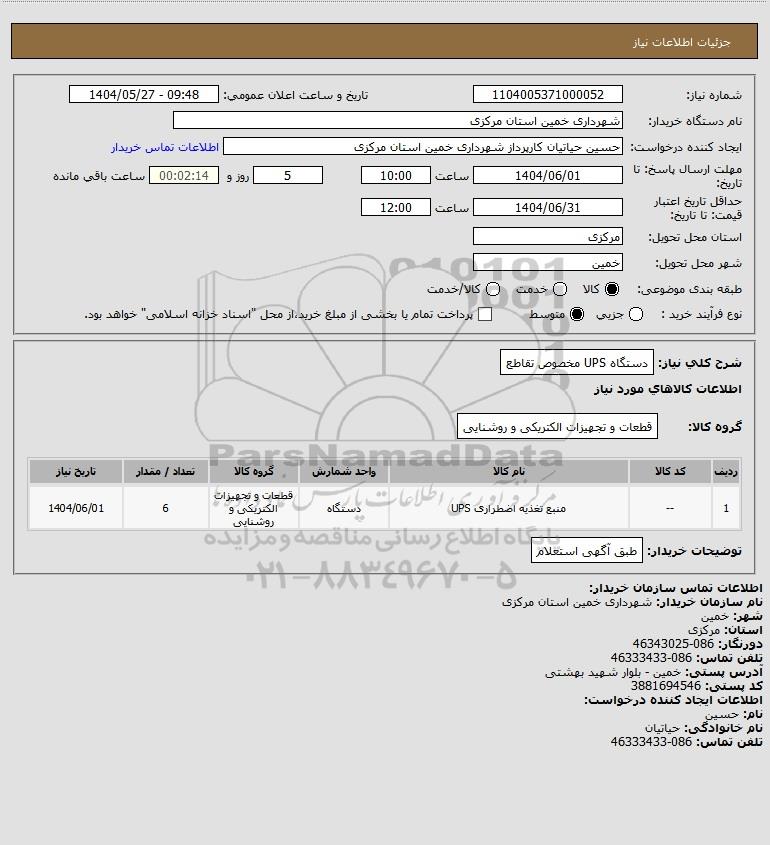 | 1 | -- | منبع تغذیه اضطراری UPS | دستگاه | قطعات و تجهیزات الکتریکی و روشنایی | 6 | 1404/06/01 |