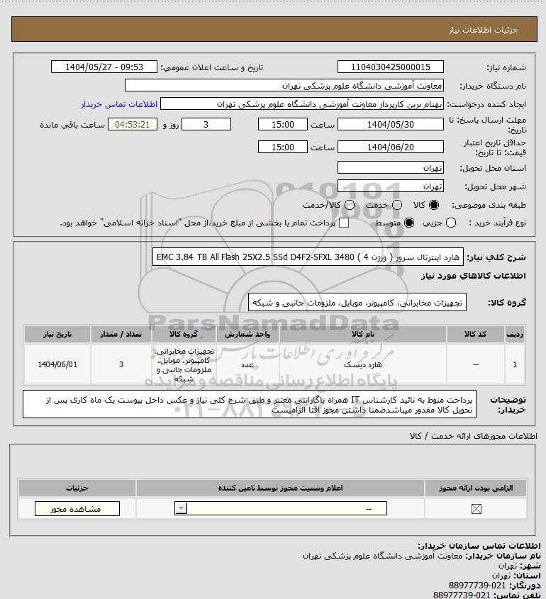 | 1 | -- | هارد دیسک | عدد | تجهیزات مخابراتی، کامپیوتر، موبایل، ملزومات جانبی و شبکه | 3 | 1404/06/01 |
